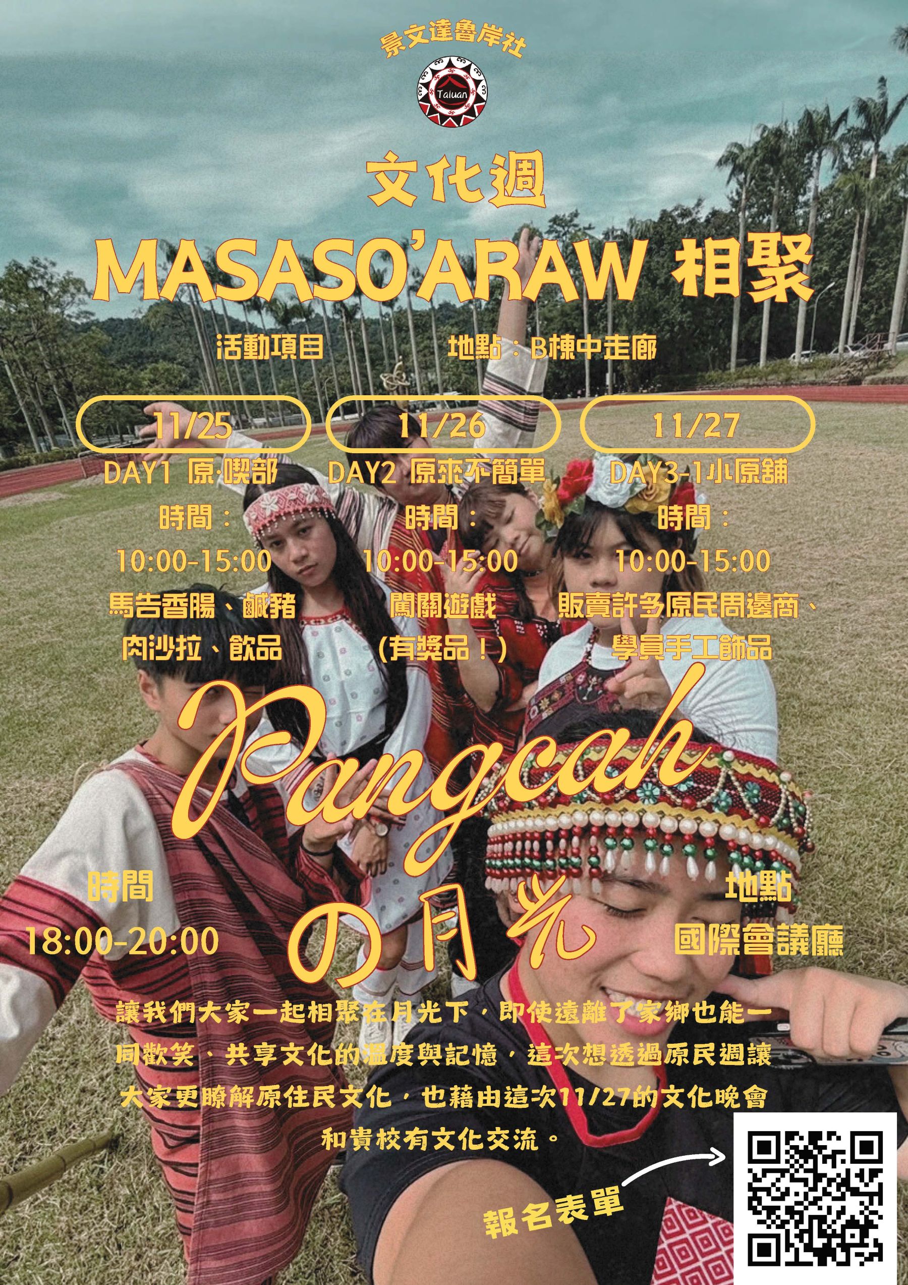 【活動轉知】景文科技大學-原住民族學生資源中心於114年11月25日(星期二)至11月27日(星期四)辦理「Masaso’araw-相聚」原住民文化週活動。