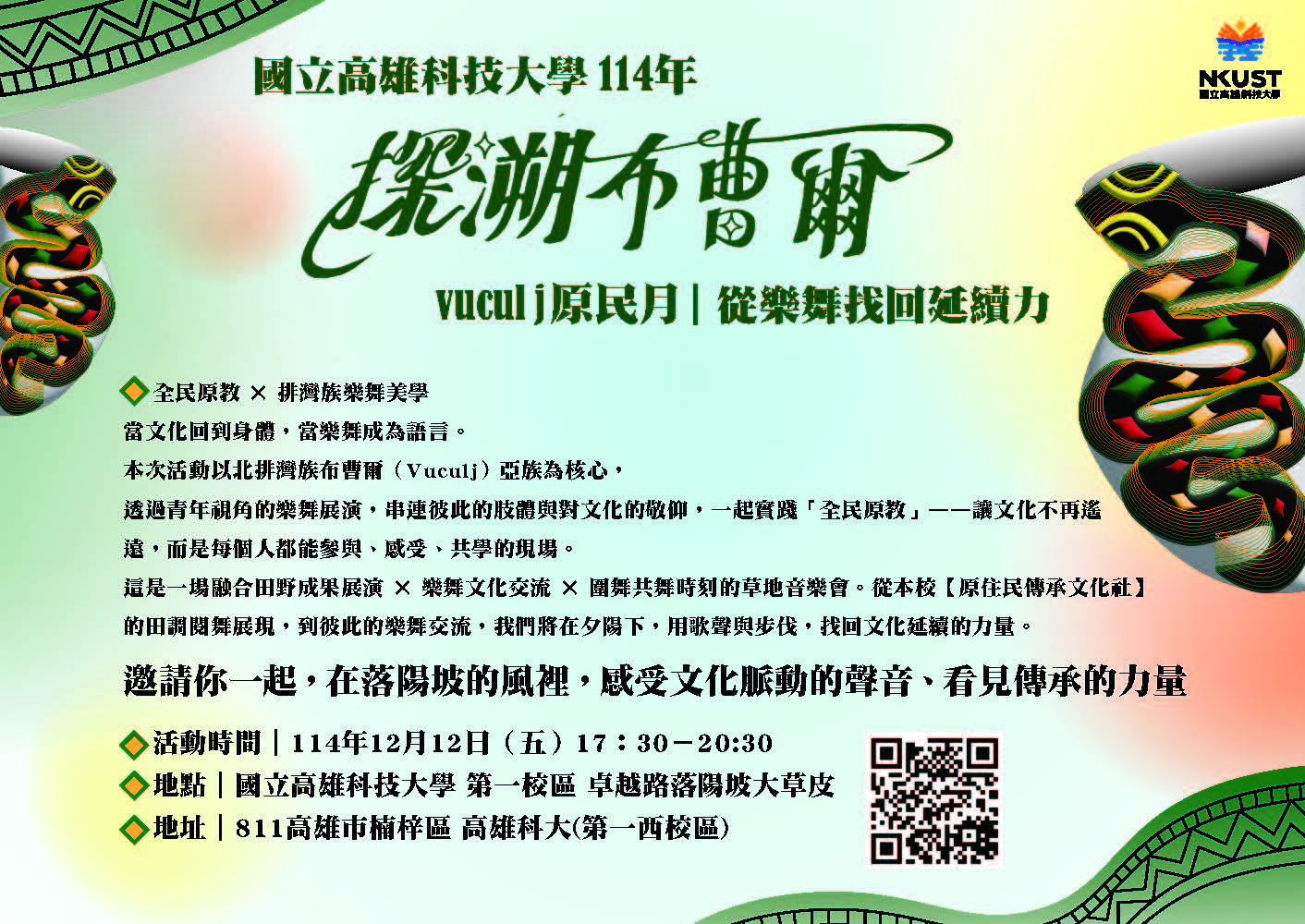 【活動轉知】國立高雄科技大學-本校原住民族學生資源中心辦理辦理114年【探溯布曹爾:Vuculj文化月】最終場「從樂舞找回延續力」草地音樂會活動